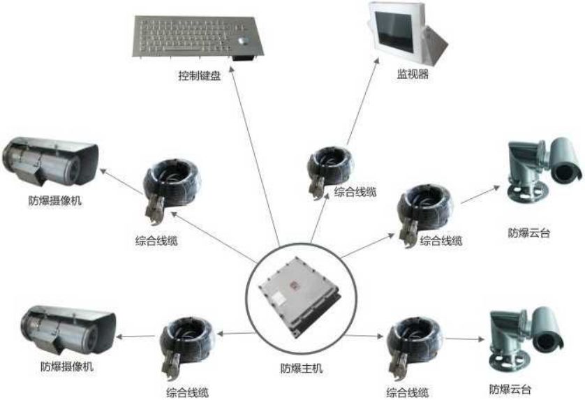 前端視頻采集點(diǎn)釆用我公司的BNK-2系列防爆攝像儀(該攝像儀為不銹鋼材質(zhì),內(nèi)置高清一體化攝像機(jī)可選碳鋼),其中固定點(diǎn)部分采用能調(diào)節(jié)的支架,移動(dòng)點(diǎn)部分采用全不銹鋼防爆電動(dòng)云臺(tái)。