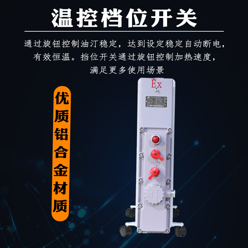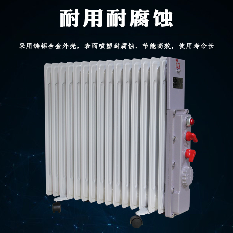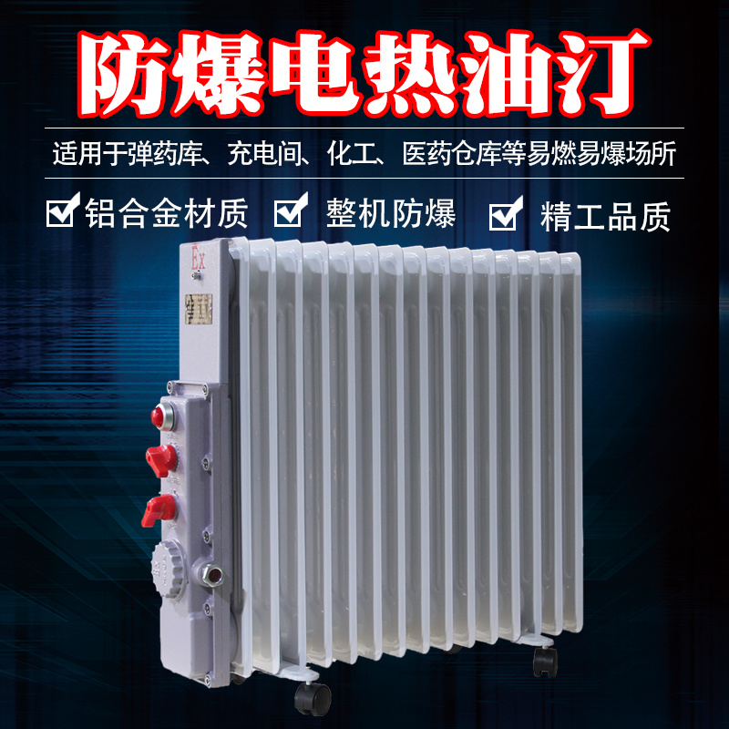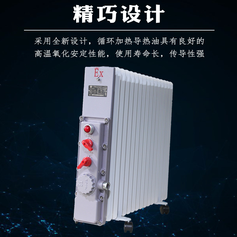 1、本列產品防爆空間加熱器的一種,其腔體內充有導熱油,外面有大面積的散熱片,當接通電源后,內置電熱元件周圍的導熱油被加熱,然后通過散熱向空間發熱量,達到取效果。
